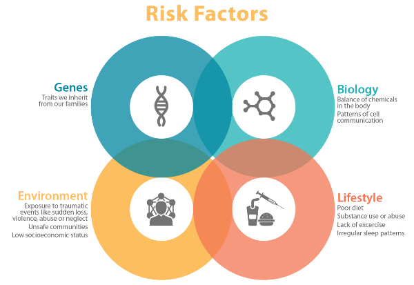 The risk factors for the development of depression are numerous but we can summarise them into 4 general categories: